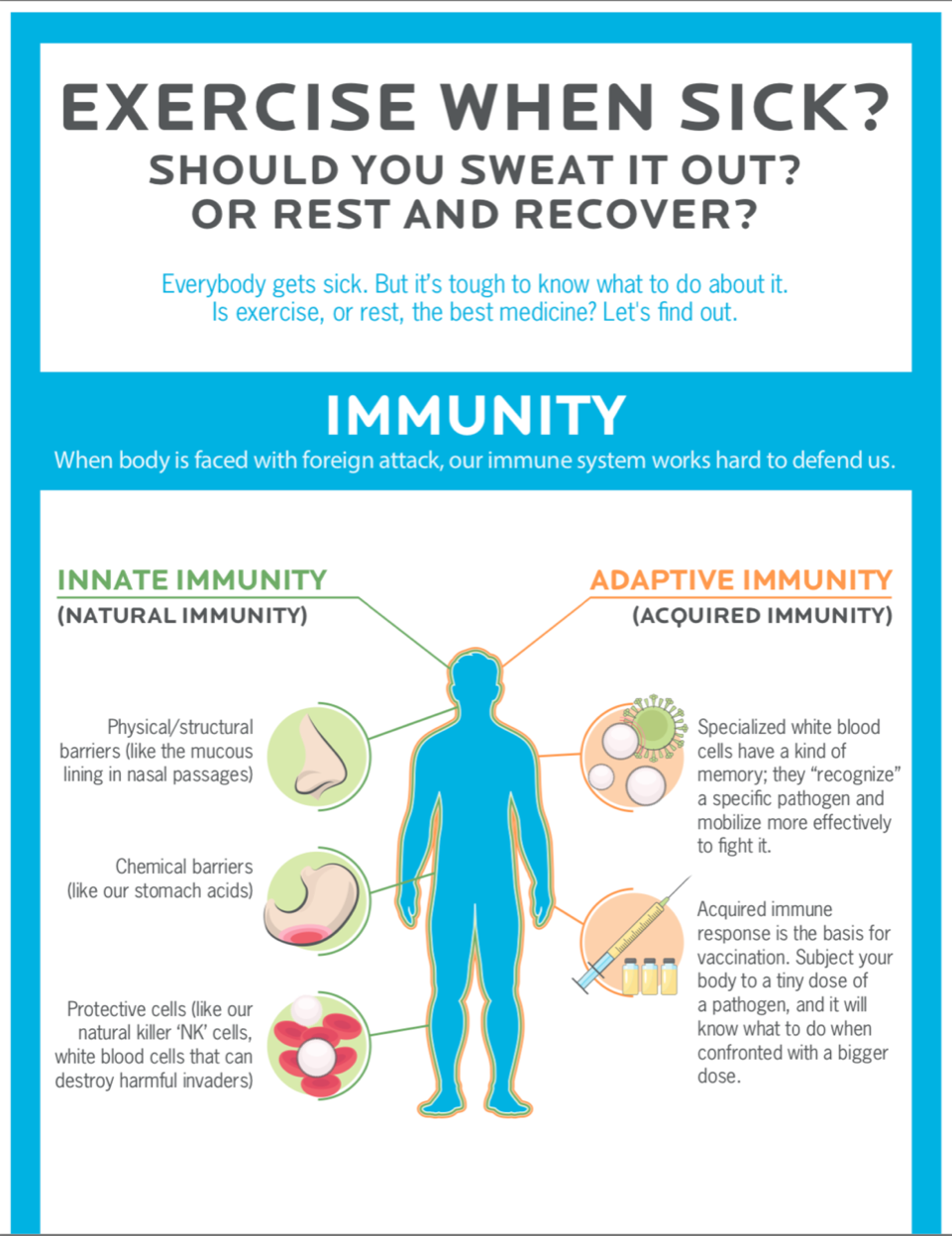 As a rule of thumb, we don’t recommend people to workout (in terms of going to the gym and doing a strength or met-con) when they are sick. We believe that it is better to take care of your self and get better. Take 2-3 days to get healthy, by eating good quality food, staying hydrated, getting lots of sleep/rest, and taking an immune booster to let your body fight it off. Its better to take those 2-3 days rather than fight it and feel like crap for 2 weeks.